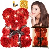 Ten wyjątkowy zestaw Rose Bear 25 cm z misiem z płatków róż, eleganckim pudełkiem, ciepłymi lampkami LED i bateriami to nie tylko oryginalny prezent, ale arcydzieło ręcznej precyzji. Wykonany z neutralnego dla zdrowia tworzywa PE w odcieniach czerwieni i czerni, z satynową wstążką, gwarantuje trwały urok i niezawodne zachwycenie bliskiej osoby, idealnie oddając głębię uczuć w każdej chwili.