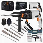 ✔️ Komplet akcesoriów w zestawie – 3 wiertła SDS, 2 dłuta, ogranicznik głębokości, uchwyt pomocniczy i walizka, umożliwiające natychmiastowe rozpoczęcie zadań.