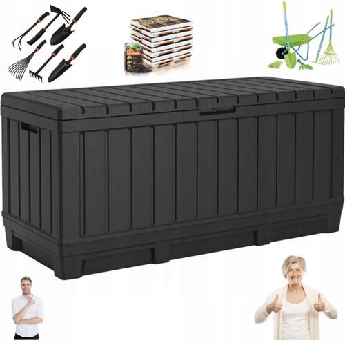 Pojemność 350 litrów pozwala na przechowywanie poduszek, narzędzi, zabawek oraz wielu innych akcesoriów ogrodowych. Dodatkowo, skrzynia pełni funkcję wygodnego siedziska, które wytrzymuje obciążenie do 220 kg.