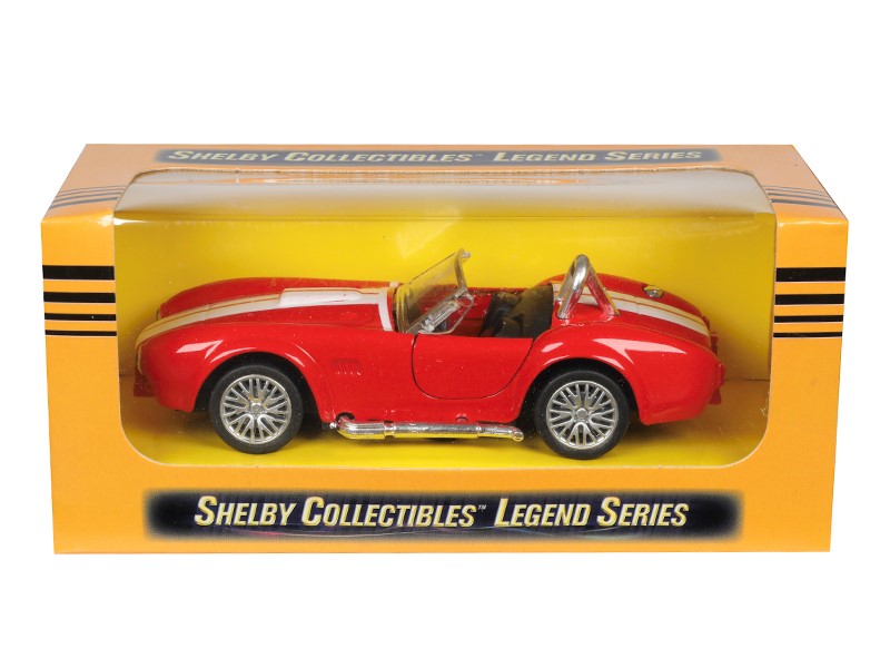 Model SHELBY Cobra wykonany jest z metalu i plastiku z napędem pull-back w skali 1:32.