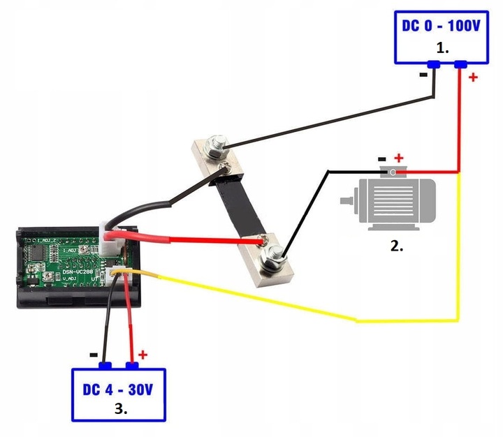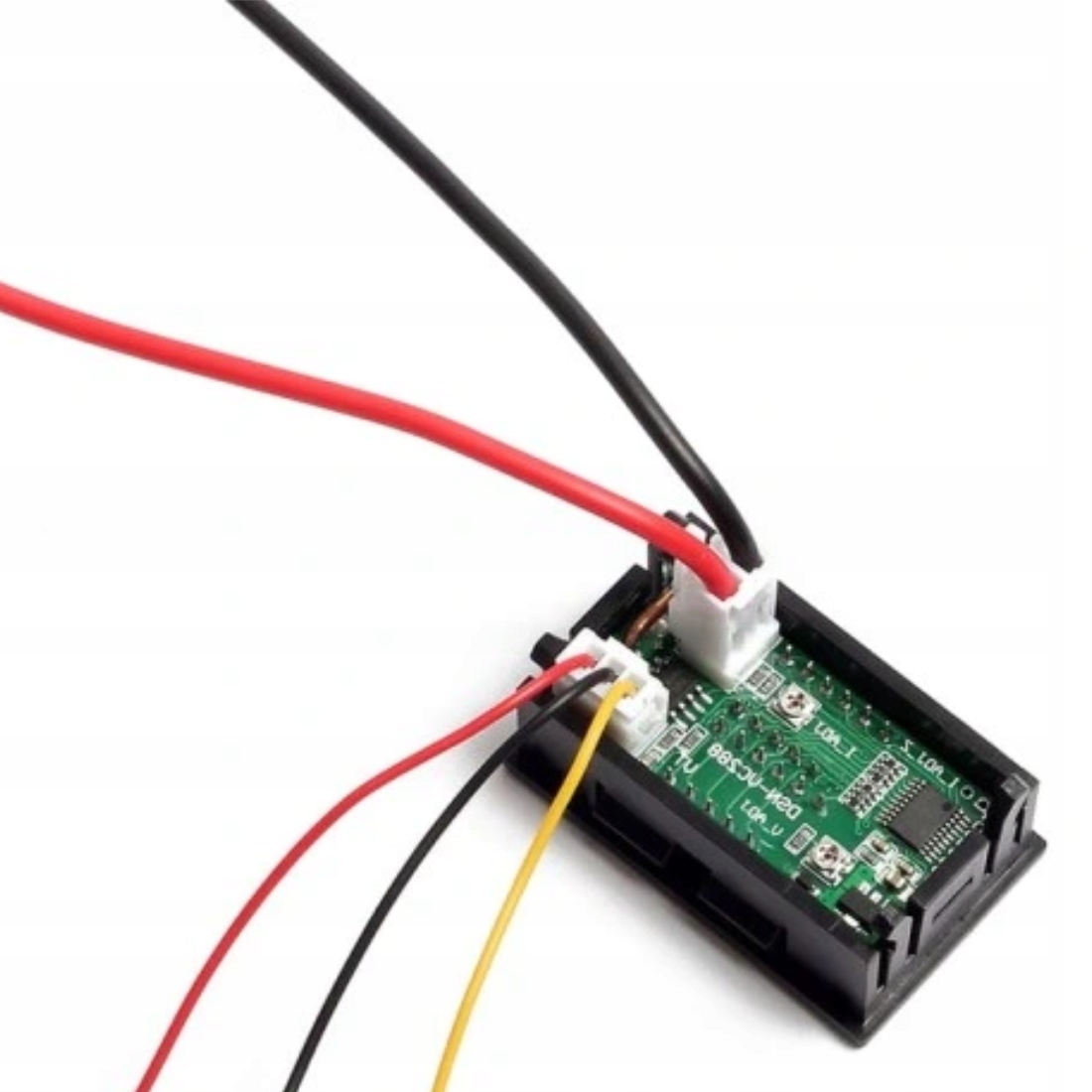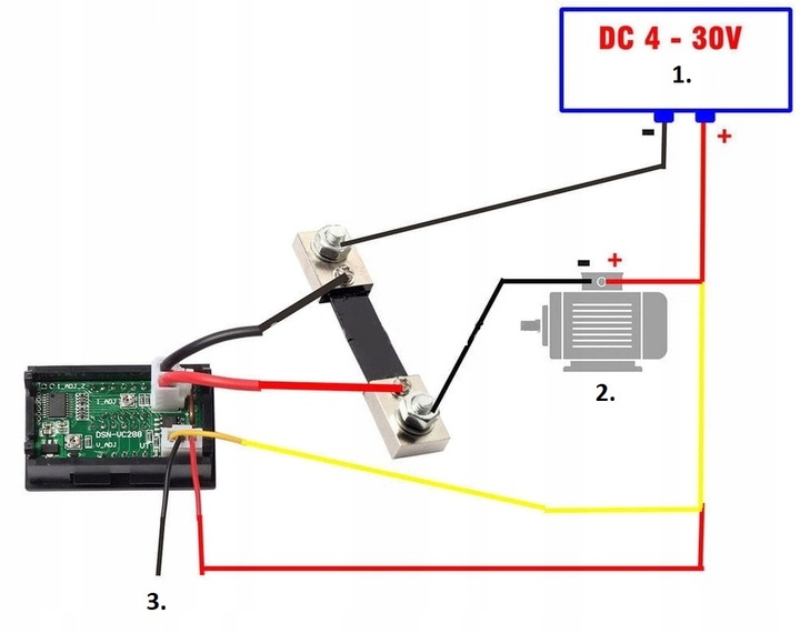 Uniwersalny moduł woltomierza amperomierza z zewnętrznym bocznikiem. Miernik zasilany jest napięciem stałym w zakresie 4V-30V DC.