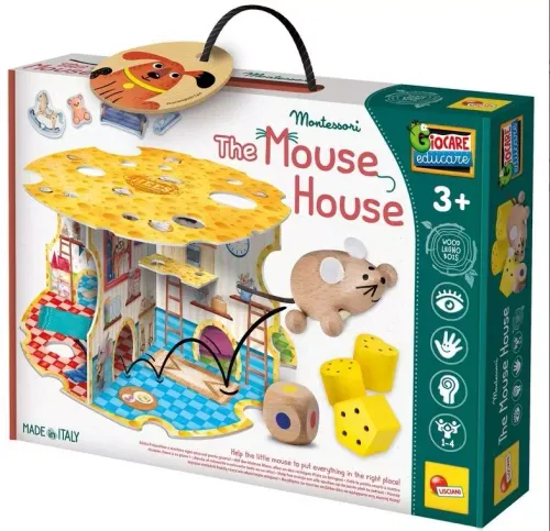 Urocza gra Montessori z drewnianą myszką, która zaprasza dziecko do swojego domku, by grać w wiele gier edukacyjnych. Korzystając z elementów znajdujących się w opakowaniu dziecko odkrywa liczby, kształty geometryczne, kolory oraz uczy się przyporządkowywać przedmioty do odpowiednich pokoi.