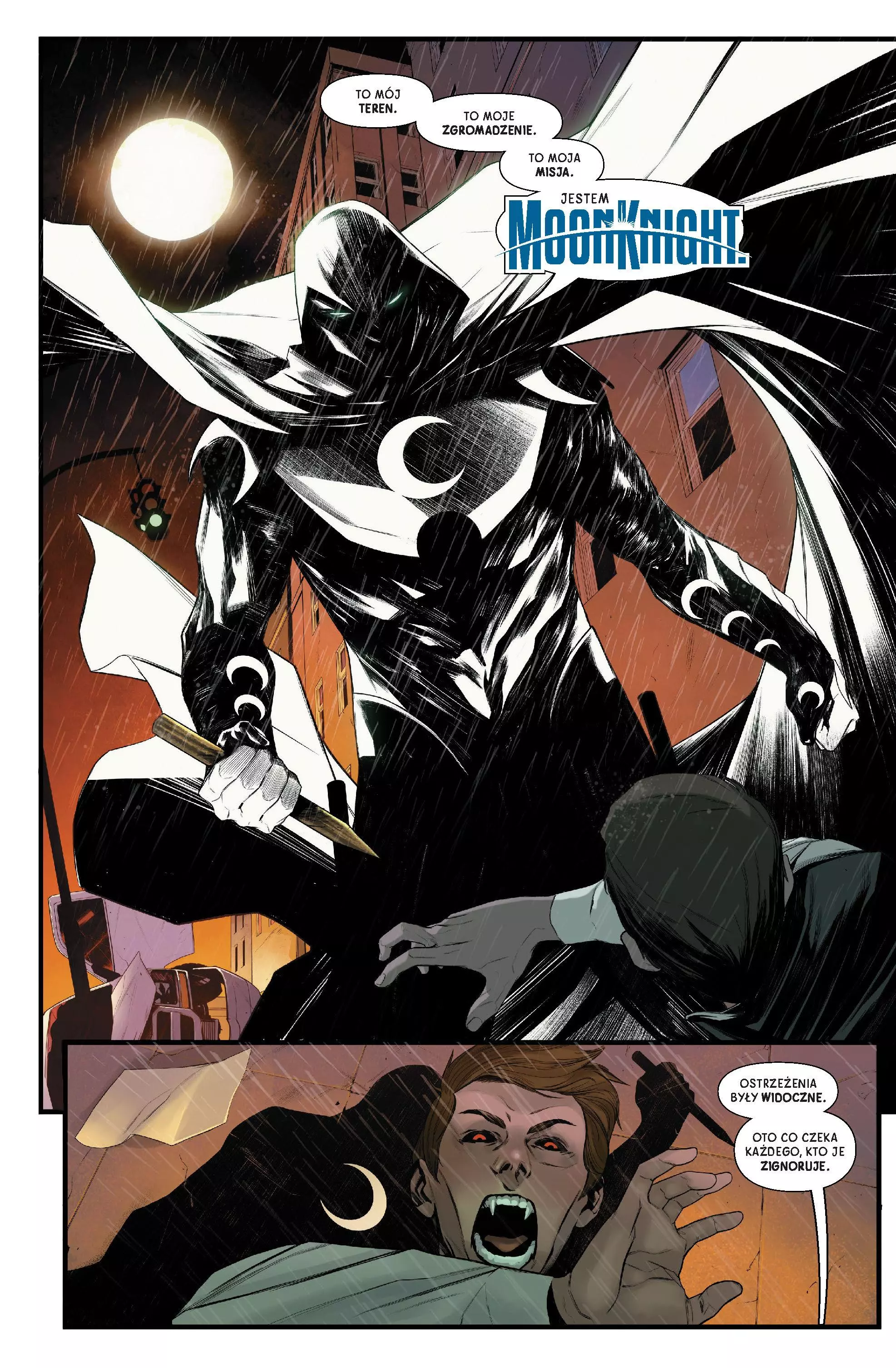 Brutalna psychologiczna opowieść o bohaterze, który działa po swojemu – bez kompromisów i fałszywego uśmiechu, za to z surową sprawiedliwością. Marc Spector, cierpiący na zaburzenia psychiczne superbohater znany jako Moon Knight, zakłada Misję Midnight. Znajdzie tam pomoc każdy, kto ma dziwne i przerażające problemy. A tych w Nowym Jorku nigdy nie brakuje! Wampiry? Są. Seryjni mordercy? Oczywiście. Żywe kamienice, które pożerają ludzi? Czemu nie! Marc, jak przystało na szaleńca, spróbuje ogarnąć ten chaos, i to zgodnie z wolą swojego patrona – egipskiego boga księżyca Khonshu. Ale czy na pewno jest jego jedynym wybrańcem? Czego chcą od niego dawna przyjaciółka i nowy arcywróg? I czy podczas diabelskich rządów Wilsona Fiska Marc wyjdzie cało z więzienia pełnego przestępców, których sam do niego wpakował? Scenariusz tego albumu napisał Jed MacKay, autor doskonale przyjętych serii o Avengers, Czarnej Kotce i Doktorze Strange’u. Rysunki stworzyli Alessandro Cappuccio („Strange Academy”, „Ultimate Wolverine”) i Federico Sabbatini. Album zawiera materiały opublikowane pierwotnie w zeszytach „Moon Knight” (2021) #1–12 i „Devil’s Reign: Moon Knight” (2022) #1. Tytuł oryginalny: Moon Knight vol. 1: The Midnight Mission, Moon Knight vol. 2: Too Tough to Die Scenarzysta: Jed MacKay Ilustrator: Alessandro Cappuccio, Federico Sabbatini Tłumacz: Jacek Żuławnik