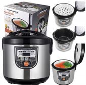 Multicooker wykonany jest z wysokiej jakości stali nierdzewnej, zapewniającej trwałość i łatwość w utrzymaniu czystości. Dodatkowo, w zestawie znajdują się praktyczne akcesoria, takie jak miarka, łyżka do ryżu, chochla oraz koszyk do gotowania na parze.