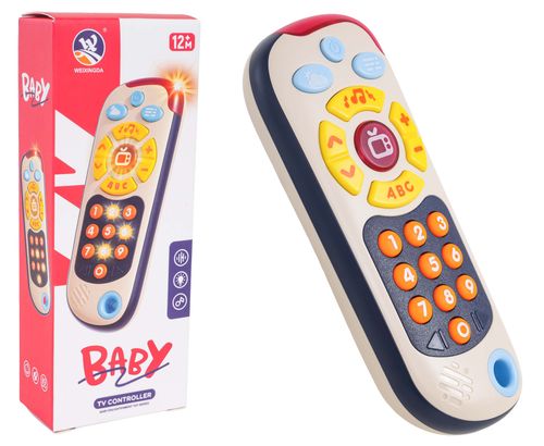 | Interaktywny pilot dla maluszków od dwunastego miesiąca życia. Zabawka wykonana została z najlepszej jakości tworzywa sztucznego i nie posiada ostrych zakończeń. Bogactwo kolorów i funkcji przyciąga uwagę maluszka i zachęca do interaktywnej zabawy. Na górze pilot posiada podświetlenie, są też trzy niebieskie przyciski: włącznik/wyłącznik, przycisk z chmurką uczący rozróżniać pogodę (słonecznie, wietrznie, deszczowo) oraz przycisk z wyborem trybów: numery, kanały telewizyjne i gra ubij kreta. Niżej znajduje się żółte koło z przyciskami, a w centrum koła podświetlany przycisk z telewizorem. Przycisk z nutką i ABC uruchamia melodie, +/- to regulacja głośności a ^/v zmienia między trybami. Na dole znajduje się klawiatura numeryczna od 0 do 9. W trybie numerycznym po naciśnięciu na dany numer słyszymy jego nazwę w języku angielskim oraz odgłos zwierzątka. W trybie telewizyjnym po naciśnięciu na przycisk usłyszymy odgłosy: muzyka, odgłosy zwierzątek, powitanie, emocje, nazwy miesięcy, żywności, pór roku, tygodni. W trybie ubij kreta, podświetlają się przyciski, a maluch musi je zręcznie naciskać. Zabawka zasilana jest bateriami typu 2 x AAA 1,5V (brak w zestawie).
