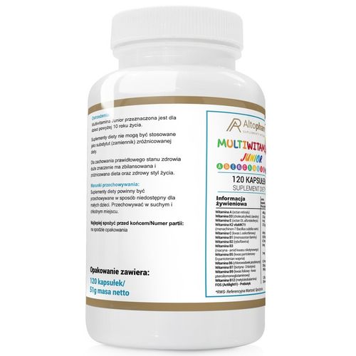 Ta wysokiej jakości multiwitamina Altopharma Junior zawiera kompleks 13 starannie wyselekcjonowanych witamin, w tym witaminę A, D3, E, K2 w postaci vitaMK7®, C oraz witaminy z grupy B. Został opracowany z myślą o zaspokojeniu specyficznych potrzeb dzieci powyżej 10 roku życia, zapewniając im niezbędne składniki odżywcze dla prawidłowego wzrostu i rozwoju.