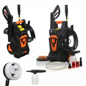 ✔️ Wyposażenie obejmuje: pistolet z blokadą, lancę wysokociśnieniową i wąż wysokociśnieniowy, dysza rotacyjna, regulowaną dyszę, zestaw do czyszczenia piany, myjka do powierzchni.