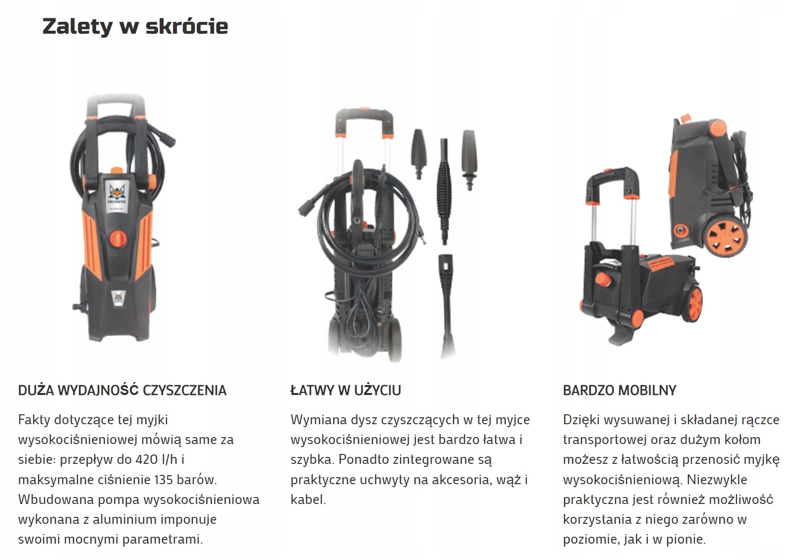 Korzystając z myjki DELTAFOX, oszczędzisz nie tylko czas, ale i wysiłek. Silne ciśnienie i możliwość wyboru różnych dyszy – w tym dyszy wachlarzowej i igły do czyszczenia – pozwalają na dostosowanie siły strumienia wody do indywidualnych potrzeb, co czyni to urządzenie naprawdę wszechstronnym. Ze względu na swoje niewielkie wymiary (30,00 × 31,00 × 53,00 cm) i wagę 7,50 kg, myjka jest niezwykle poręczna.