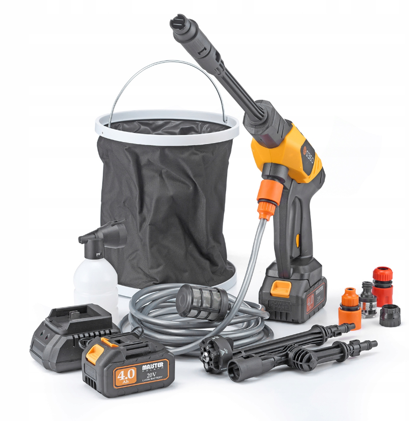 Myjka posiada na wyposażeniu długi wąż oraz komplet niezbędnych dysz. Dzięki zasilaniu akumulatorowemu urządzenie możemy zabrać ze sobą wszędzie, gdzie zajdzie taka potrzeba. W zestawie znajduje się rozkładane wiadro, które umożliwia użytkowanie myjki bez podłączenia do bieżącej wody.