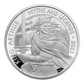 Srebrna moneta Myths & Legends: King Arthur 1 uncja Srebra 2023 Proof ukazuje władcę historycznej Brytanii Króla Artura, bohatera niezliczonej liczby legend, dzieł literackich i filmów. Znany jest między innymi ze słynnego dzieła "Rycerze okrągłego stołu".