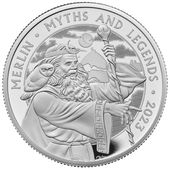 Srebrna moneta Myths & Legends: Merlin 2 uncje Srebra 2023 Proof ukazuje jednego z bohaterów legend arturiańskich, niezliczonej liczby legend, dzieł literackich i filmów. Znany jest między innymi ze słynnego dzieła "Rycerze okrągłego stołu".