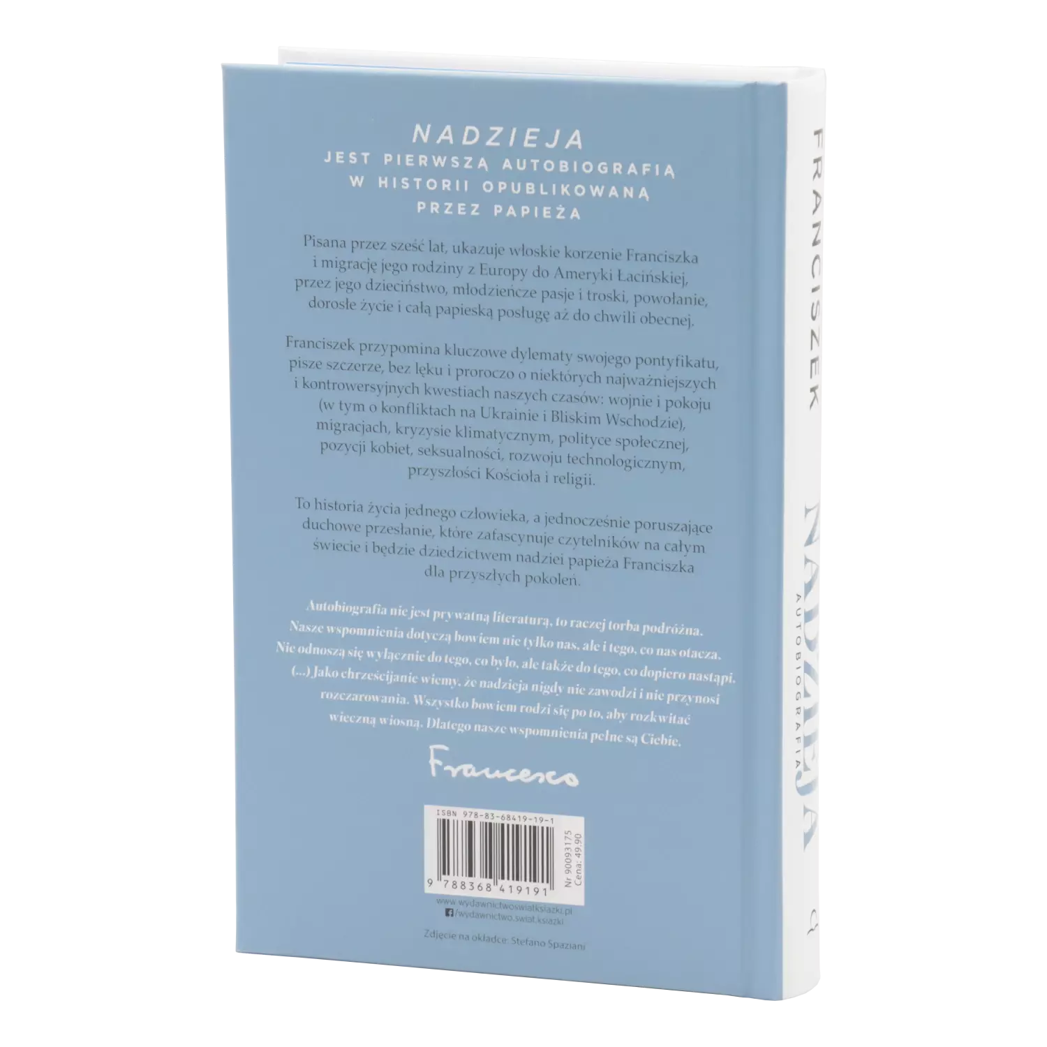 Początkowo papież Franciszek chciał, aby ta wyjątkowa książka została opublikowana dopiero po jego śmierci, ale potrzeby naszych czasów i Jubileuszowy Rok Nadziei 2025 skłoniły go do udostępnienia swych wspomnień i refleksji już teraz. Nadzieja jest pierwszą autobiografią w historii opublikowaną przez papieża. Pisana przez sześć lat, opisuje włoskie korzenie Franciszka i migrację jego rodziny z Europy do Ameryki Łacińskiej, przez jego dzieciństwo, młodzieńcze pasje i troski, powołanie, dorosłe życie i całą papieską posługą aż do chwili obecnej. Franciszek przypomina kluczowe dylematy swojego pontyfikatu, pisze szczerze, bez lęku i proroczo o niektórych najważniejszych i kontrowersyjnych kwestiach naszych czasów: wojnie i pokoju (w tym o konfliktach na Ukrainie i Bliskim Wschodzie), migracjach, kryzysie klimatycznym, polityce społecznej, pozycji kobiet, seksualności, rozwoju technologicznym, przyszłości Kościoła i religii. Nadzieja to z jednej strony istna skarbnica przemyśleń i anegdot, a z drugiej fascynujący i bardzo ludzki pamiętnik – miejscami poruszający, czasami zabawny. Historia życia jednego człowieka, a jednocześnie poruszające duchowe przesłanie, które zafascynuje czytelników na całym świecie i będzie dziedzictwem nadziei papieża Franciszka dla przyszłych pokoleń. Książkę wzbogacają niezwykłe fotografie, w tym prywatne i niepublikowane materiały udostępnione przez papieża Franciszka.