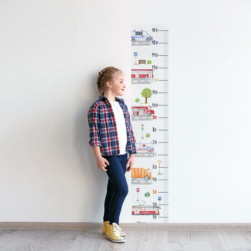 Naklejka na ścianę miarka wzrostu dla dzieci z kolorowymi pojazdami: radiowozem, autobusem, wozem strażackim, karetką pogotowia, śmieciarką i tramwajem.