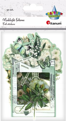Naklejki foliowe Titanum Craft-Fun Series to zestaw 30 aplikacji samoprzylepnych w tonacji białej. Zawiera 9 wzorów kwiatów, po 3 sztuki z każdego wzoru, oraz 3 etykiety retro. Dzięki foliowej powierzchni naklejki mają trwały i błyszczący wygląd, co czyni je doskonałymi do ozdabiania kartek okolicznościowych, zaproszeń, albumów oraz innych projektów DIY. Biała tonacja i kwiatowe motywy nadają projektom subtelnego i eleganckiego charakteru.