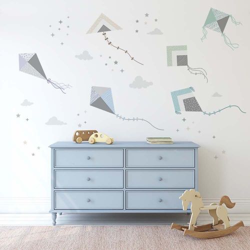 Zestaw drukowanych naklejek z latawcami w chłodnej pastelowej kolorystyce, zawiera wszystko, co potrzebne do stworzenia wyjątkowej dekoracji w pokoju dziecięcym.