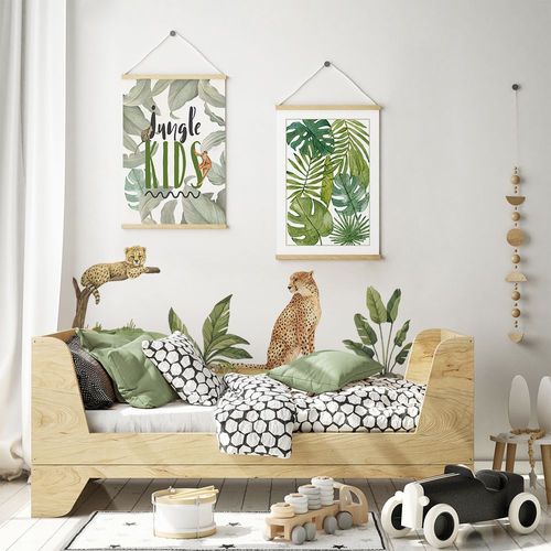 Zestaw drukowanych naklejek na ścianę wycinany z folii matowej z gepardami i roślinnością.