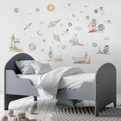 Nie ma lepszego sposobu na szybką transformację przestrzeni niż z pomocą naszych naklejek. Dzięki imponującej ilości elementów, które zawierają kosmicznych mieszkańców, rakiety, satellity, komety i gwiazdy, możesz na nowo zaaranżować każde pomieszczenie w swoim domu. Naklejki sprawdzą się doskonale nad łóżkiem, biurkiem, komodą, a nawet na meblach, drzwiach i lustrach!
