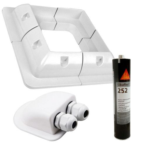 Komplet do montażu zawierający narożniki, przejściówkę dachową i klej Sikaflex 252. Służy do zapewnienia bezpiecznego mocowania paneli fotowoltaicznych do dachów kamperów, przyczep kempingowych czy łodzi.