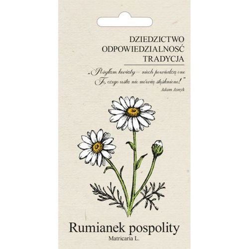 Nasiona Rumianek pospolity 0,2g. Rumianek pospolity to roślina zielna, jednoroczna, rzadko uprawiana w ogrodach natomiast często rosnąca dziko w Polsce. Rumianek ma małe wymagania: preferuje gleby gliniaste, piaszczyste, przepuszczalne oraz tereny ruderalne, lubi słoneczne stanowiska. Sieje się go wprost do gruntu w - kwietniu/maju. Rośliny kwitną od późnego lata do wczesnej jesieni wydzielając charakterystyczny, przyjemny zapach. Na początku kwitnienia - można zebrać koszyczki kwiatowe lub całe rośliny i suszyć je w ciemnym, suchym, przewiewnym miejscu (powiązane w pęczki, powieszone kwiatami w dół). Napar z rumianku ma wiele właściwości leczniczych: działa przeciwzapalnie i przeciwbakteryjnie. Polecany jest przy dolegliwościach żołądkowych, skurczach jelit, ale również jako okład zewnętrzny przy zapaleniu spojówek, gojeniu się ran czy też oparzeń. W trosce o środowisko opakowanie wyprodukowane zostało z ekologicznego Graspapieru. Opakowanie może zostać poddane recyklingowi. Specyfikacja: Wysiew: IV-V na głębokość 1 cm. Rozstaw: 30x5-10 cm. Kwitnienie: VII-VIII. Wysokość rośliny: 30 cm. Waga: 0,0002 kg. Producent: W. Legutko.