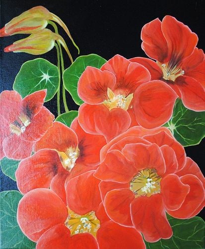 Ręcznie malowany obraz olejny z nasturcjami! Dostępny na blejtramie z zamalowanymi bokami. Sygnowany i werniksowany. Cechuje się atrakcyjną stylistyką i pięknymi barwami. Obraz w rozmiarze 50x60cm!