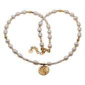 Naszyjnik z białymi Perłami hodowanymi, złotym Hematytem i zawieszką został wykonany ręcznie na lince stalowej.