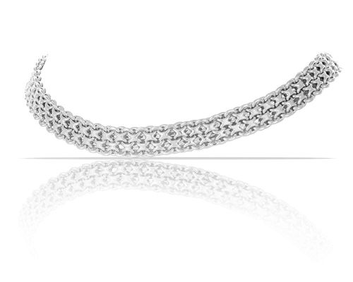 Posrebrzany, niezwykle efektowny choker typu bismark. Długość chokera 33,0 cm + przedłużka 10,0 cm, szerokość 1,3 cm. Waga naszyjnika 65,5 g.