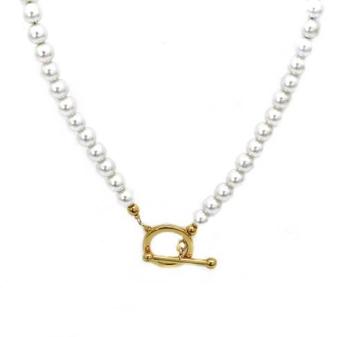 Naszyjnik z perłami z efektownym zapięciem z przodu. Długość 46 cm, zapięcie o wymiarach 2 cm x 2 cm. Warstwa złota naniesiona w metodzie electroplated * Pokryte jest w całości 4 - 8 mikronową warstwą 14K, 18K i 24K złota * Warstwa złocenia pokryta jest lakierem jubilerskim, który zabezpiecza powłokę złota przed ścieraniem i nadaje wspaniały połysk * Biżuteria wykonana ze stali szlachetnej-należy do grupy stali o strukturze austenitycznej ( podobna chirurgiczna 316 L) : - jest hipoalergiczna i nie uczula, ponieważ nie emituje związków niklu do organizmu - nie koroduje, nie odbarwia się i długo cieszy swoim blaskiem - ścieralność uzależniona od noszenia i od pH ciała - nie wymaga specjalnej konserwacji jak biżuteria ze srebra, czy złota Ze względu na różne ustawienia monitorów oraz różną jakość wyświetlaczy zastosowanych w urządzeniach mobilnych, kolory przedstawione na zdjęciach mogą nieznacznie różnić się od rzeczywistych. Dokładamy wszelkich starań, aby na stronie Sklepu przedstawiać tylko realne zdjęcia produktów, jak najbardziej zbliżone do rzeczywistości.