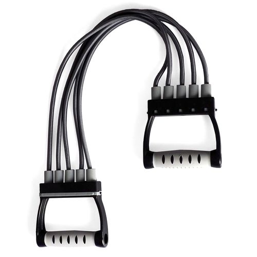 Ekspander złożony z pięciu odpinanych gum, umożliwiających regulację oporu. Dobrze wyprofilowane uchwyty zapewniają wygodę podczas użytkowania. Doskonałe urządzenie do ćwiczeń górnych partii ciała.