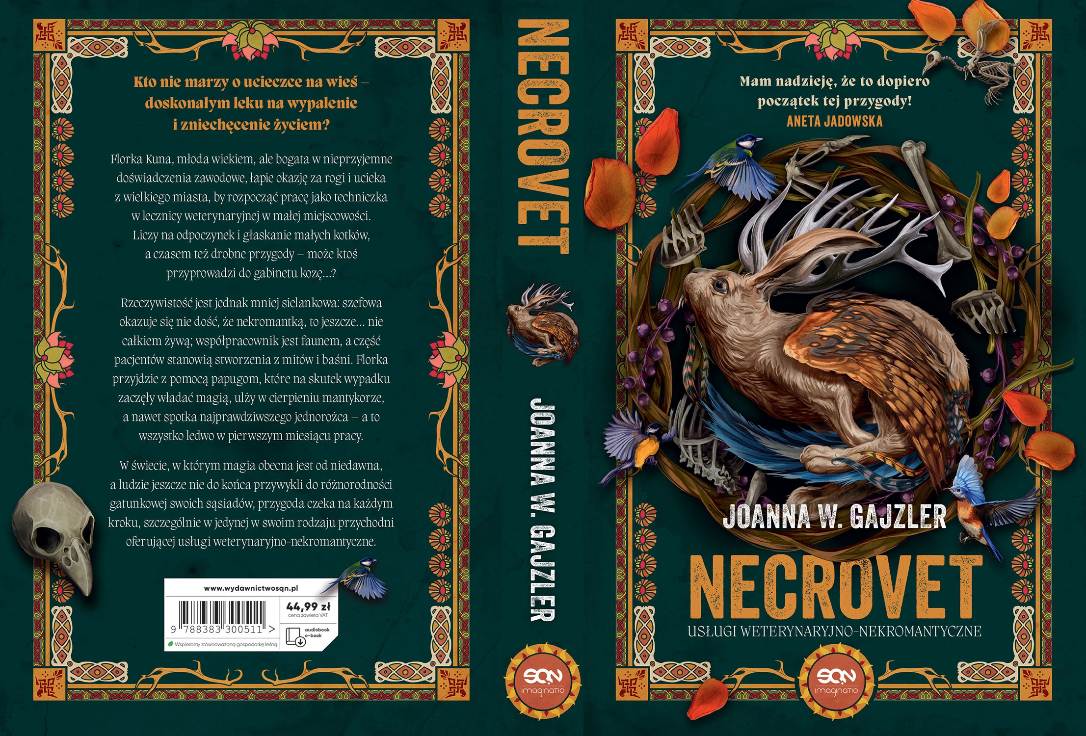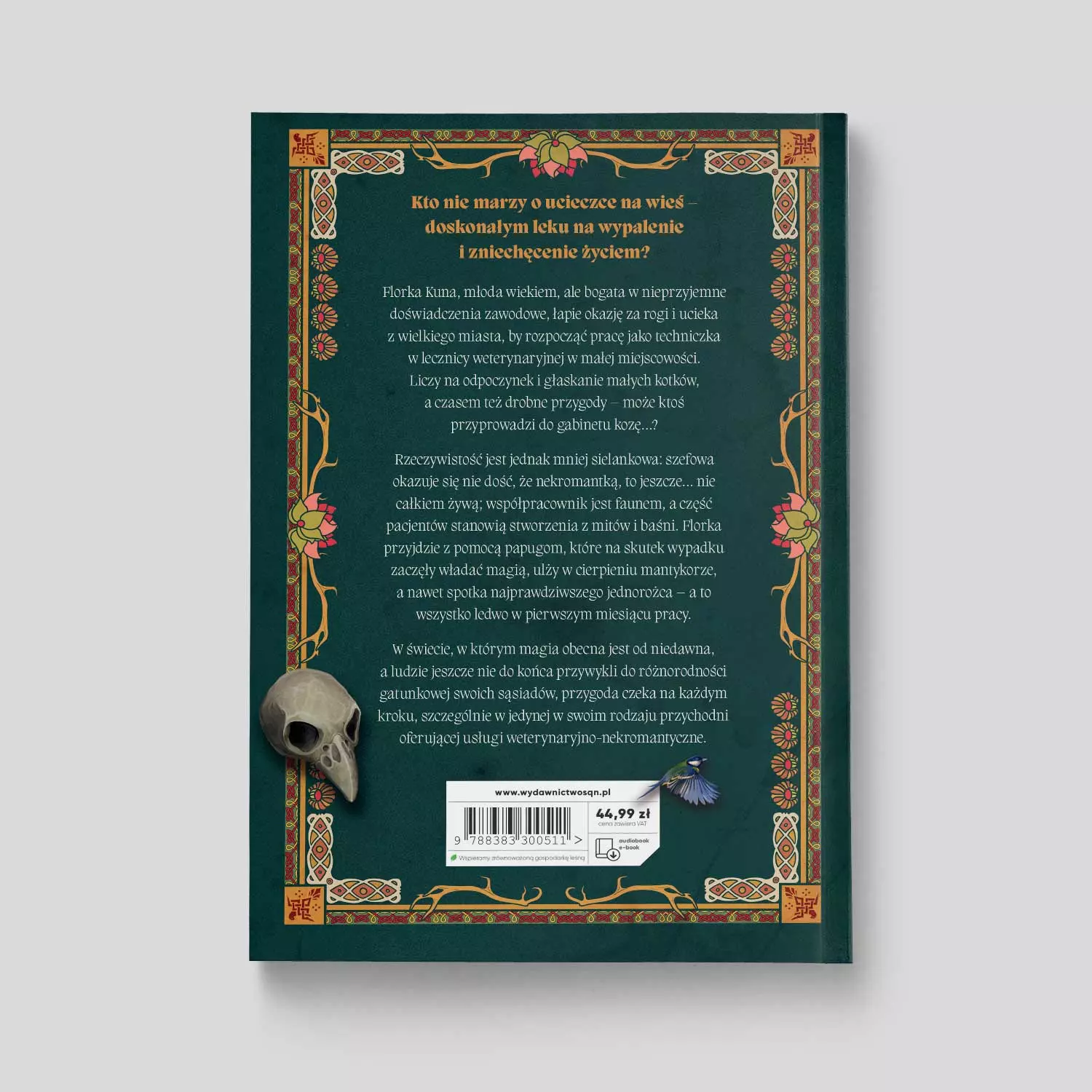 Kto nie marzy o ucieczce na wieś – doskonałym leku na wypalenie i zniechęcenie życiem? Florka Kuna, młoda wiekiem, ale bogata w nieprzyjemne doświadczenia zawodowe, łapie okazję za rogi i ucieka z wielkiego miasta, by rozpocząć pracę jako techniczka w lecznicy weterynaryjnej w małej miejscowości. Liczy na odpoczynek i głaskanie małych kotków, a czasem też drobne przygody – może ktoś przyprowadzi do gabinetu kozę…? Rzeczywistość jest jednak mniej sielankowa: szefowa okazuje się nie dość, że nekromantką, to jeszcze… nie całkiem żywą; współpracownik jest faunem, a część pacjentów stanowią stworzenia z mitów i baśni. Florka przyjdzie z pomocą papugom, które na skutek wypadku zaczęły władać magią, ulży w cierpieniu mantykorze, a nawet spotka najprawdziwszego jednorożca – a to wszystko ledwo w pierwszym miesiącu pracy. W świecie, w którym magia obecna jest od niedawna, a ludzie jeszcze nie do końca przywykli do różnorodności gatunkowej swoich sąsiadów, przygoda czeka na każdym kroku, szczególnie w jedynej w swoim rodzaju przychodni oferującej usługi weterynaryjno-nekromantyczne.