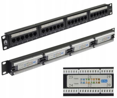 Zgodny z kategorią 5e, ten patch panel oferuje 24 nieekranowane porty RJ45, umożliwiając elastyczne i uporządkowane zakończenie kabli skrętkowych. Kolorowe kodowanie złączy zgodne z schematami T568A i T568B ułatwia instalację i zapewnia przejrzystość połączeń.