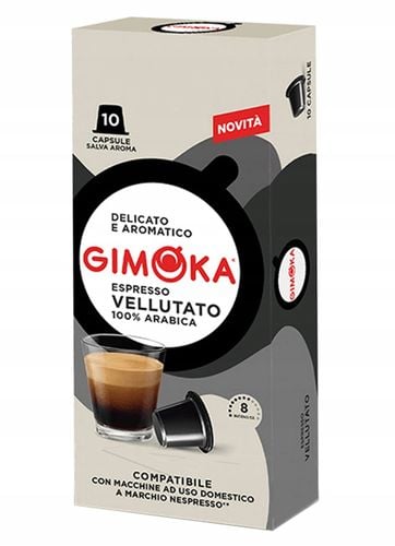 GIMOKA VELLUTATO KAPSUŁKI do systemu nespresso - 10 sztuk Gimoka Vellutato to mieszanka starannie wyselekcjonowanych ziaren arabiki, które składają się na ciekawą kompozycję wyróżniającą się nutą czekolady i owoców. Kawa w 100% Arabika o wyraźnej kremie.