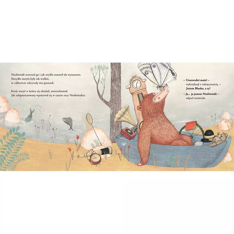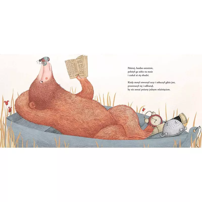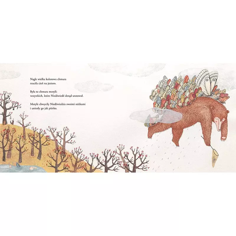 Niedźwiedź mieszkał w lesie. Najbardziej lubił spacerować, ucinać sobie poobiednią drzemkę na brzegu jeziora i zbierać rzeczy, które znajdował w gęstwinie drzew. Pewnego dnia znalazł siatkę na motyle wiszącą wysoko na gałęzi... – Co mógłbym z tym zrobić? – zastanawiał się Niedźwiedź. Wbrew pozorom motyle nie muszą się niczego obawiać: ani siatki, która służy kolekcjonerom do chwytania motyli, ani tego, że trafiła ona w niedźwiedzie łapy. Bohater tej opowieści nie powiększy swojej kolekcji znalezionych przedmiotów o złowione motyle, ani nie włączy ich do swojej diety. Przeciwnie – z wielką determinacją będzie je ratował z jeziora. Wkrótce okaże się jednak, że i on nie jest najlepszym pływakiem. Kto wyratuje tonącego Niedźwiedzia z niebezpiecznej kipieli? Niedźwiedź łowca motyli to opowieść o bezinteresownej dobroci oraz o potędze przyjaźni, która przenosi góry i leczy z samotności.