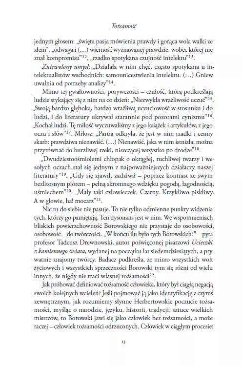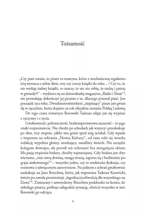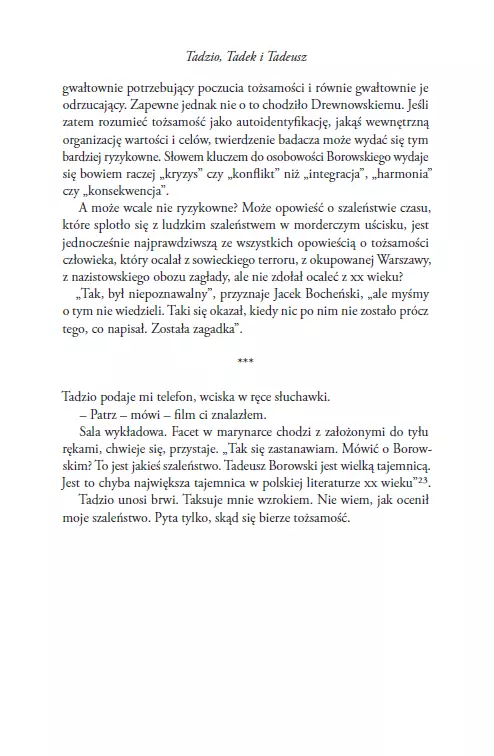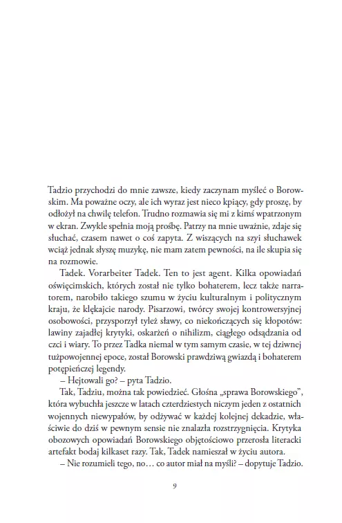 W chowanego ze śmiercią Mówiono, że śpieszył się z przeżyciem własnego życia. Gdy w 1951 roku na zebranie Związku Literatów Polskich dotarła tragiczna wiadomość, nie dowierzano, że postanowił się zabić. Przed wojną był poetą. W 1943 roku trafił do Auschwitz, gdzie zaczął pisać nowatorską prozę. Opublikowana po wojnie stała się sensacją. Nikt do tej pory nie opowiadał tak o obozach i więźniach, nikt tak bezkompromisowo nie podawał ceny przeżycia. Gdy jednak partyjni towarzysze oskarżyli go o nihilizm – przeprosił za swoją twórczość. Chciał wierzyć, że komunizm jest przepustką do nowego, wspanialszego świata. Ukochana Maria, którą odnalazł w Auschwitz i którą uśmiercił w swoim najsłynniejszym opowiadaniu, została jego żoną i urodziła mu córkę. Borowski zdążył zobaczyć dziecko w szpitalu, jednak kilka dni później postanowił wypisać się z ojczyzny i życia. Marta Byczkowska-Nowak, literaturoznawczyni i dziennikarka, na nowo odkrywa autora Pożegnania z Marią. Dociera do osób, które znały najbliższych Borowskiego i jego samego. Odnajduje człowieka tajemniczego i tragicznego, pełnego sprzeczności, gwałtownego, zapalczywego działacza i zarazem wrażliwego indywidualistę. To pierwsza biografia Tadeusza Borowskiego nieuwikłana w kontekst polityczny i środowiskowy, książka napisana z dociekliwością i empatią, wzbogacona o nowe fakty, perspektywę psychologiczną i przenikliwą analizę jego twórczości. To historia buntownika i idealisty, który do końca grał w chowanego ze śmiercią, nie przestając patrzeć jej oczy.