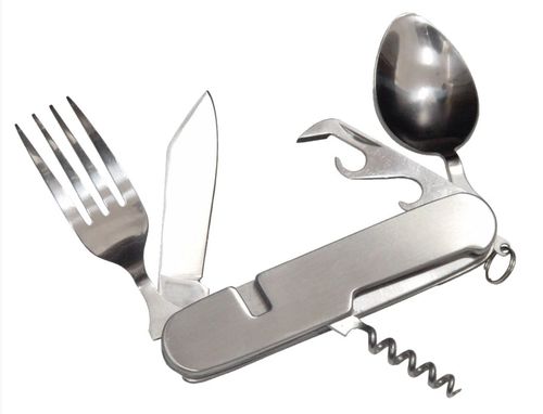 Kompaktowy niezbędnik hiszpańskiej firmy Joker, znanej głównie z produkcji doskonałych noży myśliwskich. Wykonany w całości z wytrzymałej stali nierdzewnej, solidny i prosty w obsłudze. Nóż wraz z łyżką oraz widelec znajdują się w oddzielnych modułach (łączonych za pomocą dwóch mosiężnych rygli) i mogą być wykorzystywane indywidualnie.