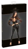 Model od marki Noir Handmade to stylowy kombinezon w kolorze głębokiej czerni, ktory wyrożnia się perfekcyjnym połączeniem materiałow: klasycznego power wetlook oraz transparentnego, miękkiego tiulu o delikatnej fakturze. Długi rękaw i nogawki podkreślają sylwetkę, zapewniając jednocześnie komfort i wygodę użytkowania przez cały czas noszenia.