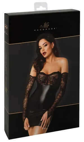 Model Noir Orgia XL to mini sukienka w klasycznej czerni, wykonana z innowacyjnej tkaniny typu powerwet, ktora wyrożnia się subtelnym połyskiem i eleganckim wykończeniem. Gorna część kreacji została ozdobiona detalami z delikatnej koronki, tworząc wyjątkowe połączenie nowoczesnej formy i klasycznej elegancji. Sukienka nie posiada ramiączek, co podkreśla linię ramion i nadaje stylizacji wyjątkowy charakter.