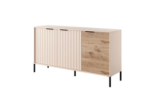 Wyposażona w pojemne szafki, komoda RAW sprawdzi się doskonale w sypialni, pokoju młodzieżowym czy domowym biurze. Jej ryflowane fronty z płyty MDF w stonowanym kolorze beżowym, zestawione z elementami w odcieniu dębu viking, nadadzą Twojemu wnętrzu wyjątkowego ciepła, rozświetlając nawet najbardziej ponure przestrzenie. Korpus mebla wykończony jest eleganckim beżem, co potęguje jego nowoczesny i minimalistyczny charakter.