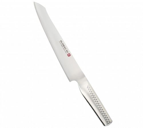 Noże Global słyną z łączenia fenomenalnej skuteczności z eleganckim designem. Są lekkie i doskonale wyważone, a ich cienkie, twarde, wytrzymałe klingi zachowują idealną ostrość przez długi czas. Dzięki jednolitej konstrukcji noże są higieniczne, lepiej leżą w dłoni i łatwiej je wyczyścić czy naostrzyć. Indywidualnie wyważana rękojeść została tak skonstruowana, by redukować zmęczenie i nie wyślizgiwać się z rąk. Noże Global, zaprojektowane w 1985 r. przez Komina Yamadę, zdobyły wiele międzynarodowych nagród i cieszą się niesłabnącym uznaniem największych mistrzów kuchni – zarówno profesjonalistów, jak i kuchmistrzów domowych. W serii NI zastosowano zmieniony kształt i rozmiar rękojeści, zapewnia to lepszy uchwyt i większą precyzję krojenia.