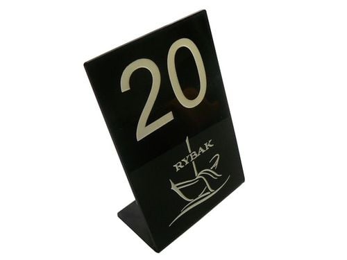 Numerek na stół w kształcie litery L wykonany jest z plexi czarnej o grubości 3 mm.