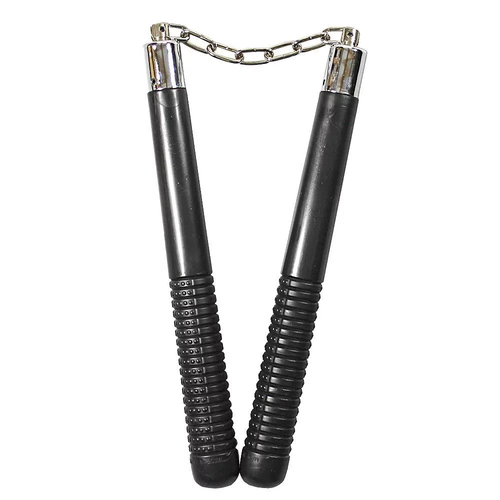 Bardzo dobrej jakości Nunchaku owalne zwężane na łańcuszkach. Wykonane z tworzywa sztucznego o profilowanych uchwytach. Polecamy dla średnio zaawansowanych oraz zaawansowanych użytkowników. Długość pałki: 29,50 cm Długość łańcucha: około 12,5 cm Długość całkowita: 73 cm Waga: około 420 g