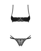 Komplet Nutris to idealna propozycja na gorącą noc we dwoje. Otwarty biustonosz z fiszbinami odsłania i podkreśla biust, a koronkowe wykończenie dodaje lekkości i klasy. Seksowne stringi z wycięciem i paskami na biodrach subtelnie eksponują pośladki, zapewniając przy tym maksymalny efekt wizualny.