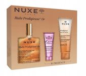 Ten wyjątkowy zestaw NUXE Huile Prodigieuse® Or to połączenie suchego olejku pielęgnacyjnego ze złotymi drobinkami (100 ml), olejku pod prysznic (100 ml) oraz szamponu wygładzającego (30 ml), które działają synergicznie, by zapewnić głębokie nawilżenie i rozświetlenie. Formuła oparta na 7 szlachetnych, 100% roślinnych olejach, w tym sfermentowanym oleju z różowej kamelii, delikatnie oczyszcza i regeneruje, pozostawiając skórę aksamitną, a włosy elastyczne i lśniące.
