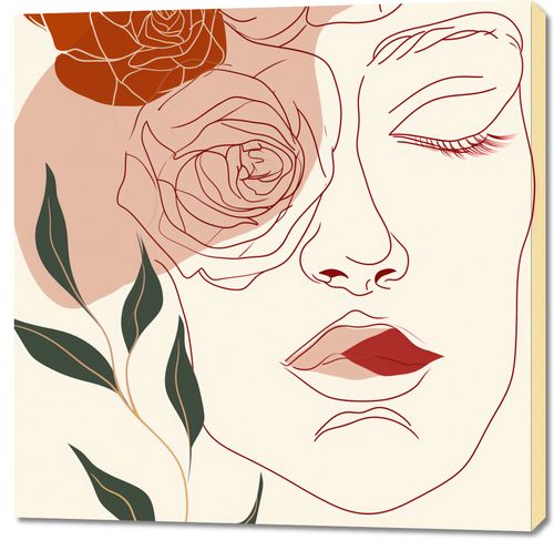 Obraz z serii abstrakcja zatytułowany Beż i Twarz. Obraz przedstawia stylizowany, linearny portret kobiety z zaznaczonymi konturami w ciepłych odcieniach beżu i różu. Twarz kobiety jest uchwycona w profilu, z subtelnymi detalami takimi jak delikatnie zamknięte oko, zarysowane usta oraz zaznaczone linie nosa i brwi. Kompozycja łączy w sobie elementy botaniczne – różę umieszczoną w górnej części obok głowy, co nadaje dziełu romantyczny i subtelny charakter. Liście i łodyga róży wiodą wzrok od dolnej części obrazu aż po jej głowę, tworząc spójną, pionową linię. Użyte kolory są ograniczone do kilku pastelowych odcieni, co sprawia, że obraz jest zarówno spokojny, jak i elegancki. Idealnie sprawdzi się jako element dekoracyjny w przestrzeniach nowoczesnych, jak i tych urządzonych w stylu vintage.