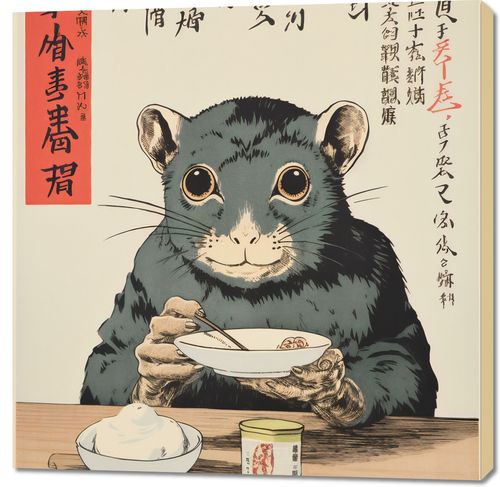 Obraz z serii motywy wschodnie zatytułowany Chwila Refleksji. Intrygujące spojrzenie gryzonia w tradycyjnym stroju, podkreślane przez błękitną tunikę i precyzyjne detale, które nadają mu humanoidalnego charakteru. Czerwone naczynia oraz kanji w tle kontrastują z jasnymi barwami obrazu, dodając nuty głębi i dziedzictwa kulturowego. Subtelna gra światła i cienia na stoliku z jedzeniem i napojem wzbogaca kompozycję i zachęca do refleksji nad połączeniem tradycji z nowoczesnością. Świetnie sprawdzi się w kawiarniach o azjatyckim klimacie, galeriach sztuki oraz w przestrzeniach dedykowanych kulturze Wschodu.