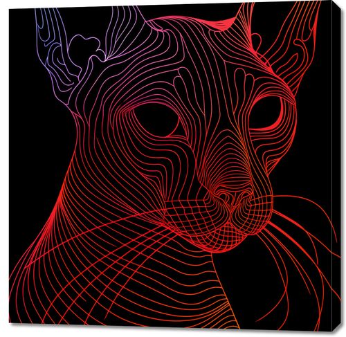 Obraz z serii pop art zatytułowany Cyfrowa Kocica przedstawia futurystyczny wizerunek kota sfinksa, wykonany za pomocą płynnych, abstrakcyjnych linii w odcieniach czerwieni i pomarańczu na głębokim, czarnym tle. Wzór linii tworzy iluzję trójwymiarowości i ruchu, podkreślając wyraziste cechy kociego profilu, takie jak duże uszy, wyłaniające się oczy i charakterystyczne rysy twarzy. Minimalistyczne użycie koloru i linii w kontraście z ciemnym tłem nadaje dziełu nowoczesny wygląd, który przyciąga wzrok i pobudza wyobraźnię. Ten artystyczny obraz świetnie wpisze się w wnętrza o nowoczesnym designie, szczególnie wśród miłośników zwierząt i miłośników sztuki cyfrowej, nadając przestrzeni odrobinę współczesnego stylu i kociego wdzięku.