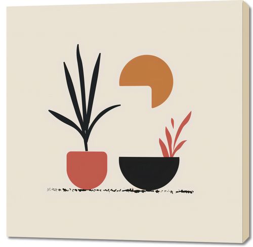 Obraz z serii boho zatytułowany Domowy Ogród. Obraz łączy proste, geometryczne formy roślin z ciepłą kolorystyką, tworząc przytulny obraz domowego ogrodu. Czerwony i czarny wazon z roślinnością wyrastają nad delikatną linia ziemi, przywołując obrazy spokojnego wnętrza. Niedokończony półksiężyc w kolorze pomarańczowym dodaje kompozycji delikatności i podkreśla domową atmosferę. Dzieło doskonale nadaje się do miejsca, które ma być oazą spokoju i relaksu, takiego jak sypialnia lub cichy kącik do czytania. Jego proste i spokojne kolory mogą również przynieść harmonię do miejsca pracy lub studiowania, promując skupienie i spokój.