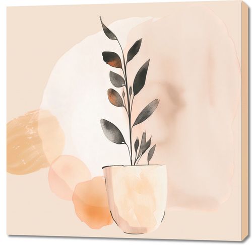 Obraz z serii wnętrza zatytułowany Doniczkowy Kolor. Obraz przedstawia minimalistyczną i stylową kompozycję roślinną na delikatnym, pastelowym tle. Centralnym punktem jest elegancka, czarno-brązowa gałązka z liśćmi w stonowanej kolorystyce, umieszczona w jasnym, beżowym doniczce o subtelnych odcieniach i delikatnym cieniowaniu. Tło składa się z miękkich, organicznych plam w odcieniach kremu, beżu i ciepłego brązowego, które tworzą efekt akwarelowy. Całość jest utrzymana w spokojnej, relaksującej palecie barw, co sprawia, że obraz ten idealnie nadaje się do przestrzeni, gdzie chcemy wprowadzić element spokoju i harmonii, jak salon czy sypialnia. Delikatność i prostota wzoru podkreślają nowoczesny charakter tego dzieła, jednocześnie zachowując ponadczasową elegancję.