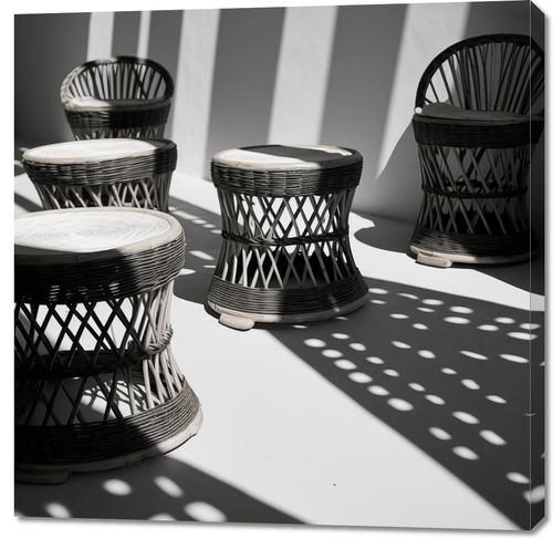 Obraz z serii wnętrza zatytułowany Gra Świateł to stylowa, monochromatyczna fotografia, która oddaje estetykę współczesnego designu. Na fotografii widzimy zestaw eleganckich, plecionych stołków z rattanu ustawionych na tle geometrycznych cieni. Ostre linie cieni przełamują okrągłe kształty mebli, tworząc fascynującą kompozycję pełną kontrastów. Białe siedziska stołków pięknie kontrastują z ciemniejszymi elementami, a gra światła i cienia nadaje scenie trójwymiarowość i teksturę. Obraz ten będzie doskonały dla miłośników minimalistycznych wnętrz, a także dla osób poszukujących elementu dekoracyjnego, który wprowadzi do pomieszczenia nowoczesny i artystyczny akcent. Idealny do nowoczesnych przestrzeni mieszkalnych, biur, kawiarni lub galerii sztuki.
