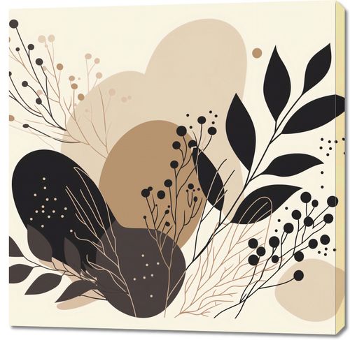 Obraz z serii minimalistyczne zatytułowany Harmonijka Przyrody. Ta grafika to estetyczna kompozycja abstrakcyjnych, organicznych kształtów i delikatnych motywów florystycznych w tonacji ziemi. Wykorzystanie różnych odcieni brązu, beżu oraz głębokiej czerni tworzy spokojną, ale i wyrafinowaną paletę barw. Kontrastowe, ciemne elementy florystyczne są pięknie zrównoważone przez jasne tło, nadając całości uczucie lekkości i elegancji.Jest to idealny wybór dla osób, które szukają subtelnego, ale wyrazistego elementu dekoracyjnego do swojego domu lub biura.