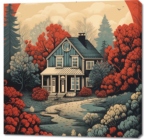 Obraz z serii wnętrza zatytułowany Idylla Rustykalna. Ten ciepły i urokliwy obraz przedstawia sielski dom otoczony przez bujny krajobraz w odcieniach czerwieni i pomarańczy, których intensywność podkreśla zachodzące słońce w tle. Kompozycja łączy w sobie elementy klasycznego amerykańskiego krajobrazu z nostalgicznym uczuciem, które przywodzi na myśl długie, leniwe popołudnia na wsi. Ilustracja ta idealnie nadaje się do nadania charakteru i ciepła każdemu wnętrzu, doskonale pasując do przestrzeni mieszkalnych, kawiarni lub pensjonatów, które chcą zaakcentować swoje powiązania z naturą i wiejskim spokojem.